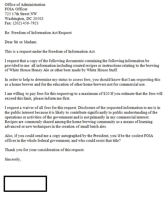A home brewer has formally requested recipes for the beers made by White House staff under the Freedom Of Information Act. Here’s a copy of the request: