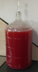 12. Transfer to a secondary fermenter. My solution for filtering out the remaining fruit pulp is to place a muslin bag inside the carboy and secure it to mouth of carboy with rubber band. The siphon tube will be inside the muslin bag so the debris will get trapped in the bag. Removing the muslin through the narrow neck helps squeeze out most of the juice. If necessary and depending on your gravity readings, top up to 21 L.